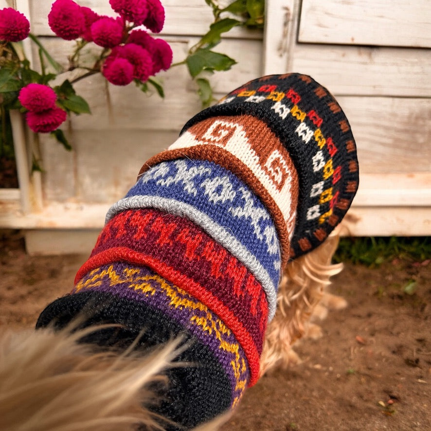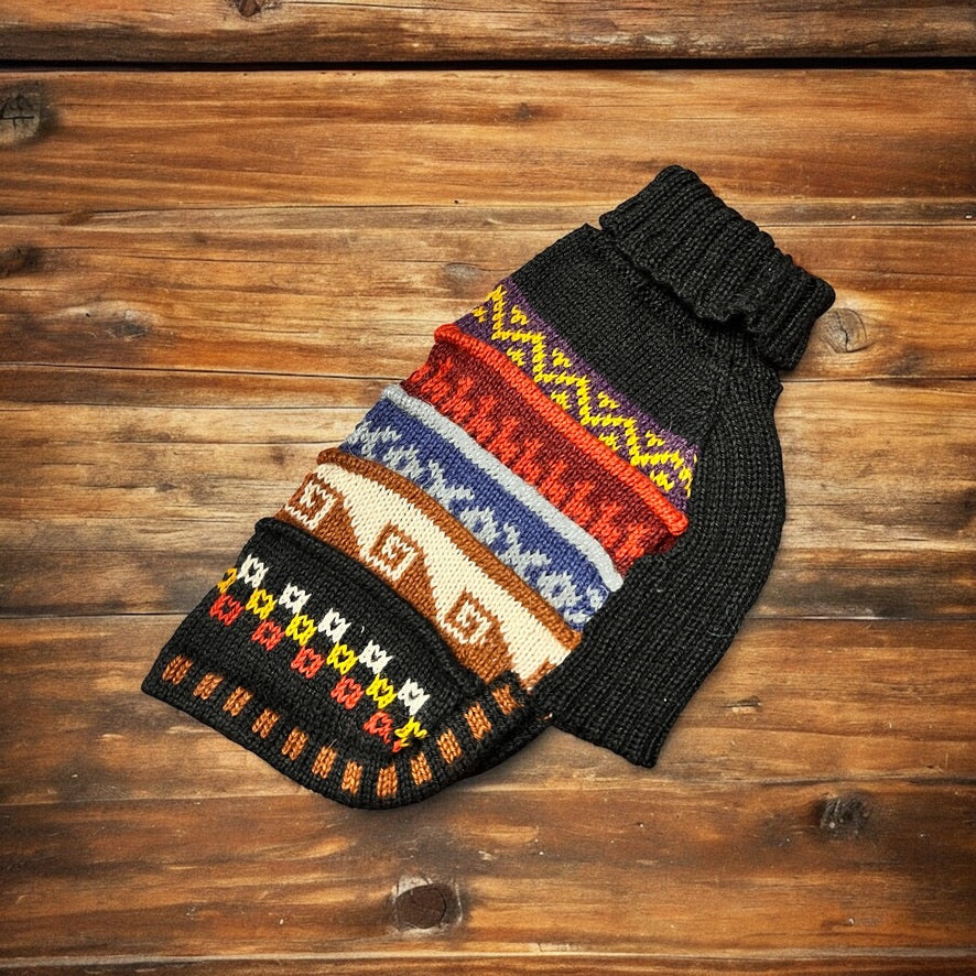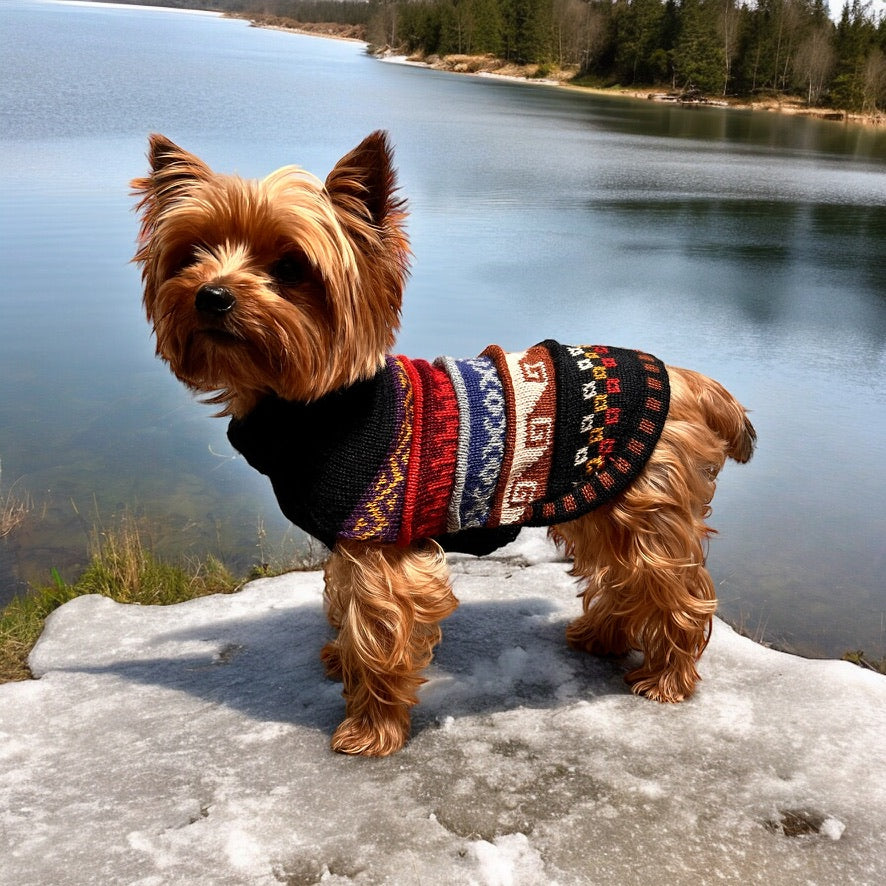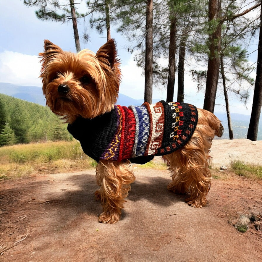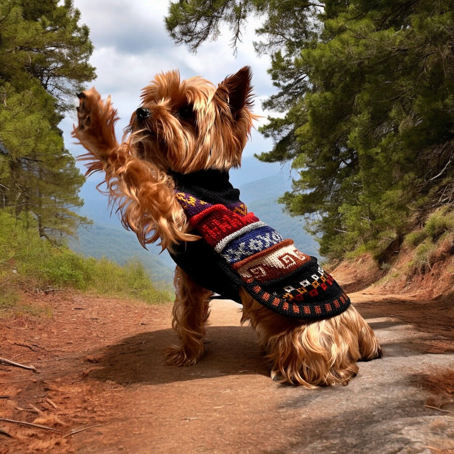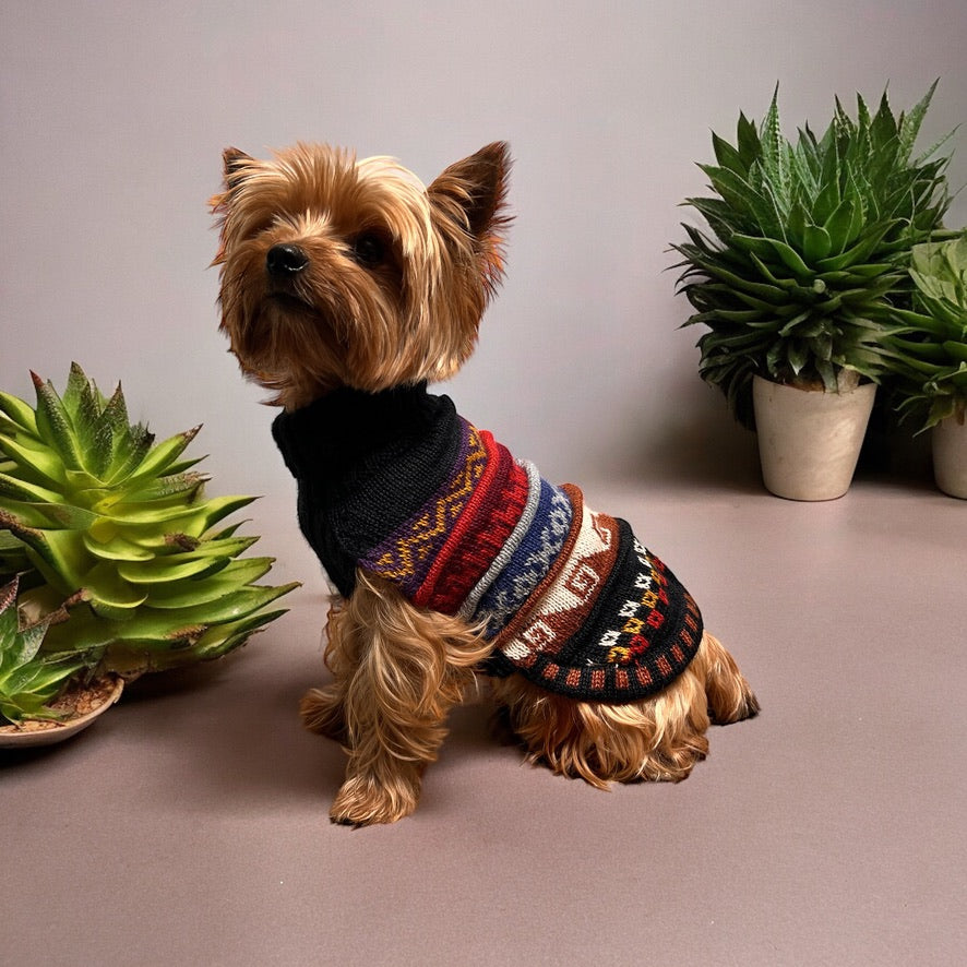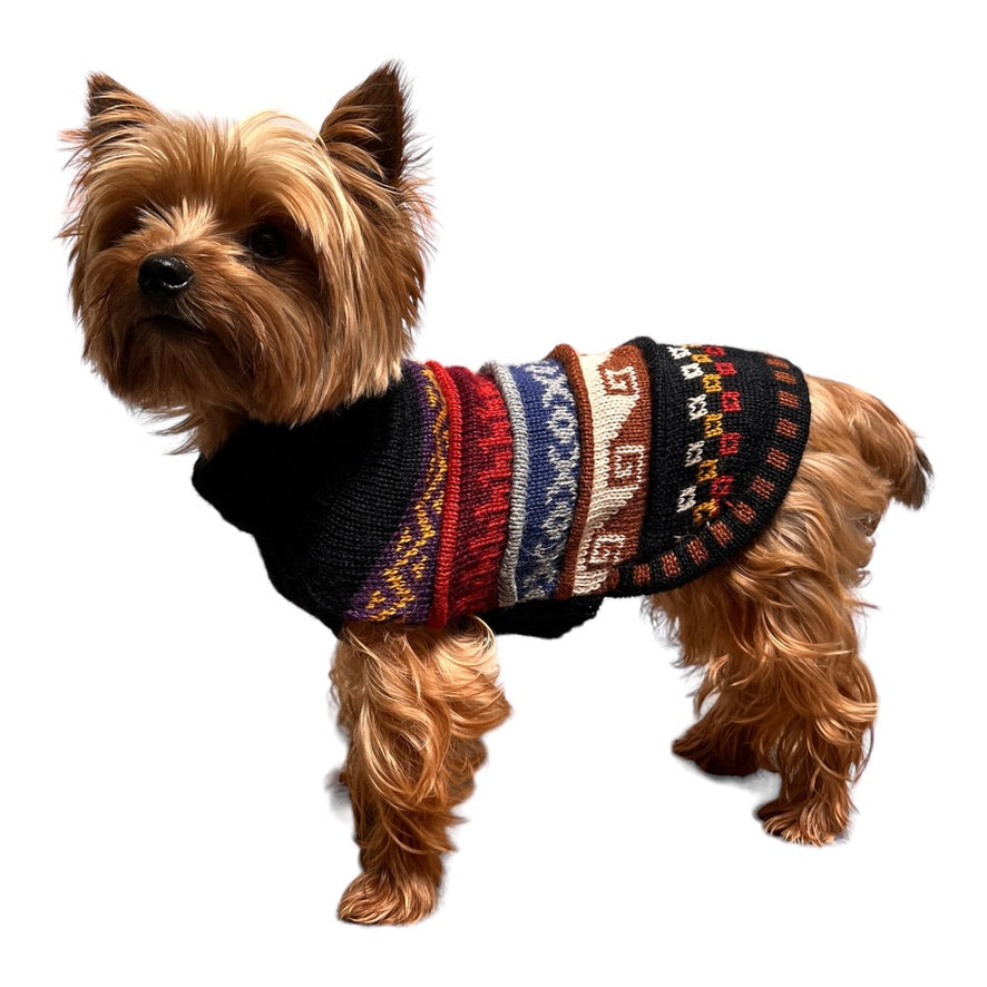 We call this doggie sweater the "Nazca", inspired by the Inca ruins in Nazca Peru. Very fascinating and definitely worth looking up but the patterns, designs, and colors are so fun!. We designed this sweater with a hole on the back so you can put your dog's harness on under the sweater and then clip the leash to the harness through the hole.