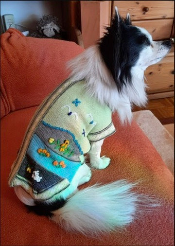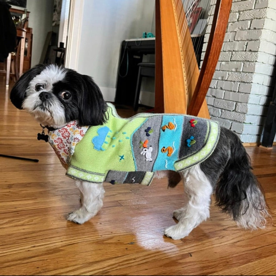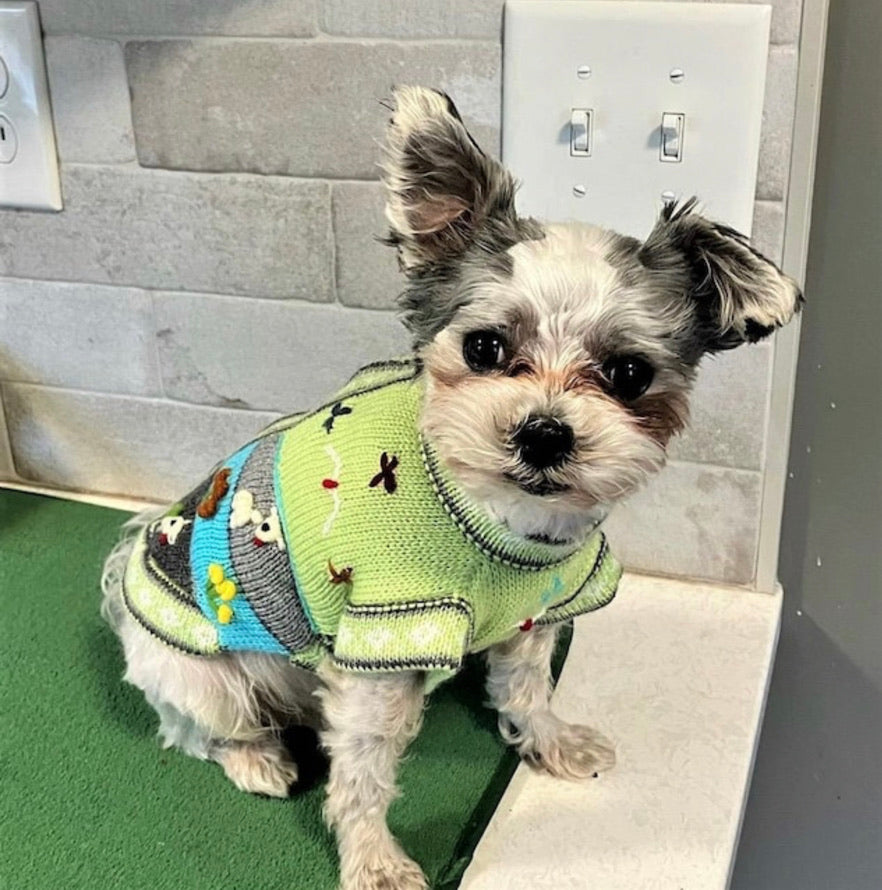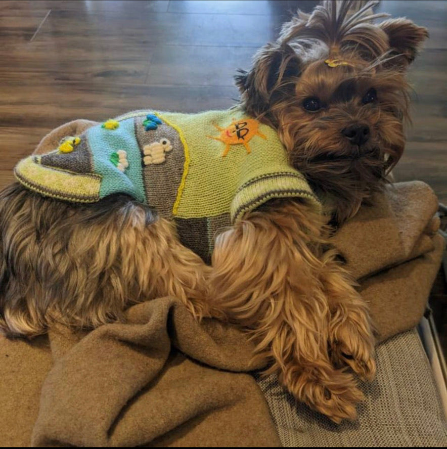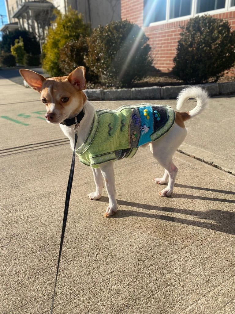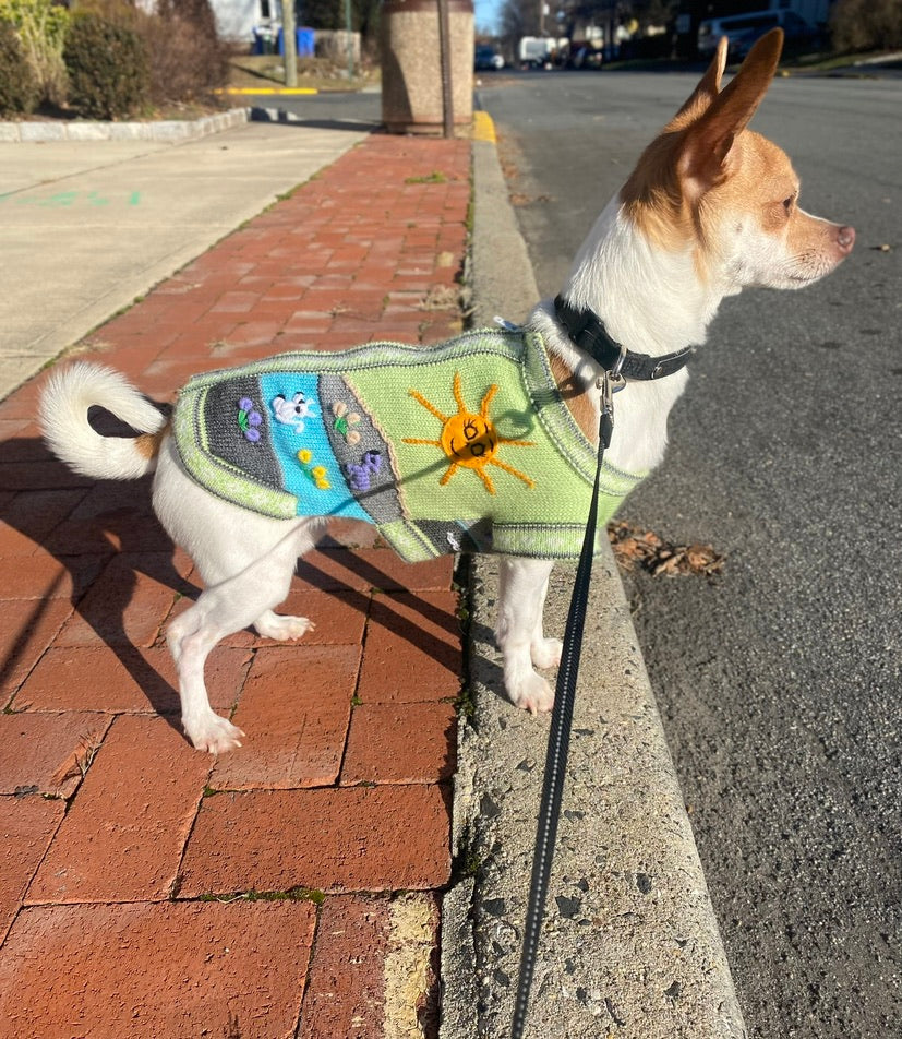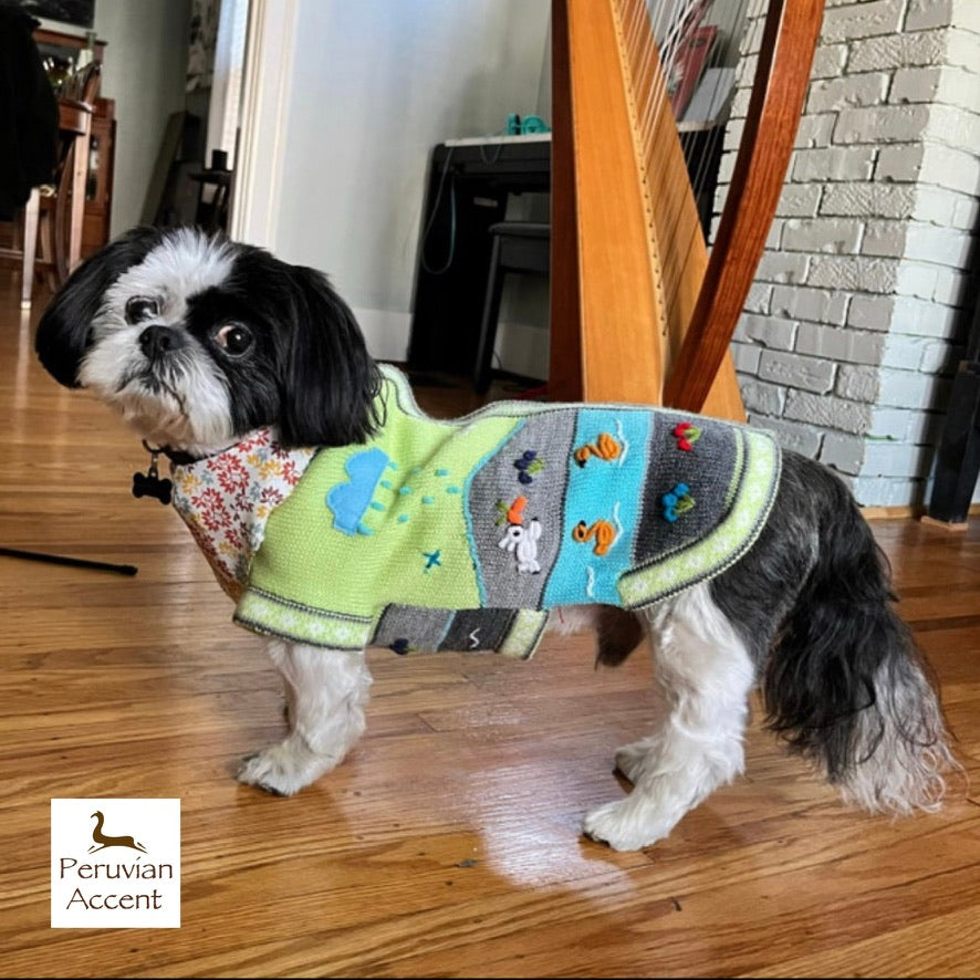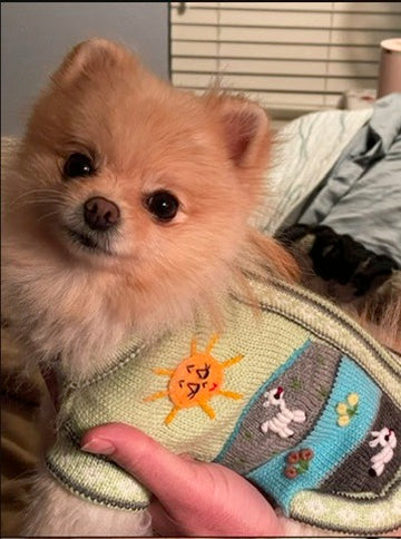 Doggies get cold too! Especially the smaller breeds. I know our Yorkie, Luna, loves her sweater and it looks so cute too! Each Peruvian Accent sweater is unique. We make the base by machine and do the applique by hand. So each one is a unique sweater.