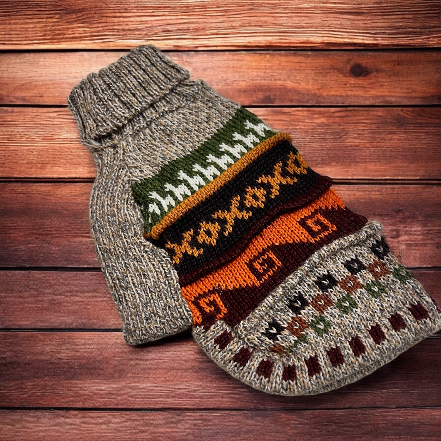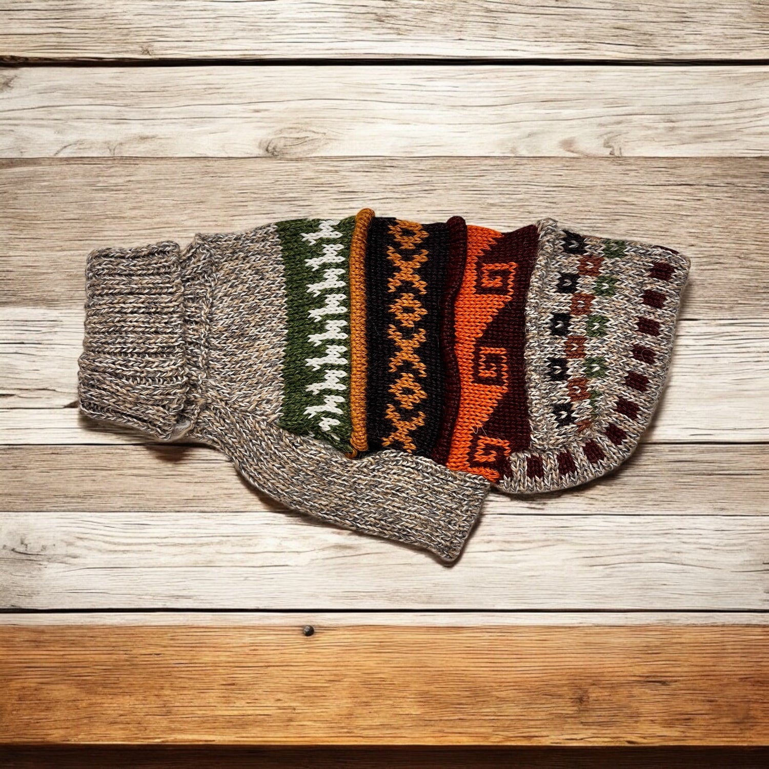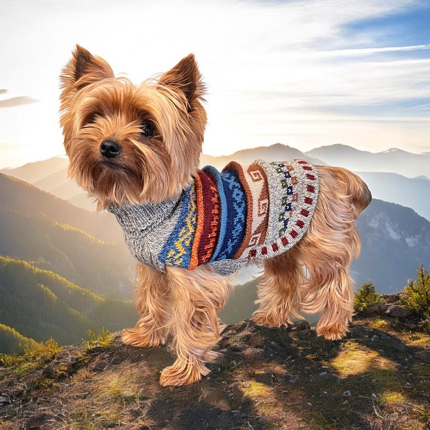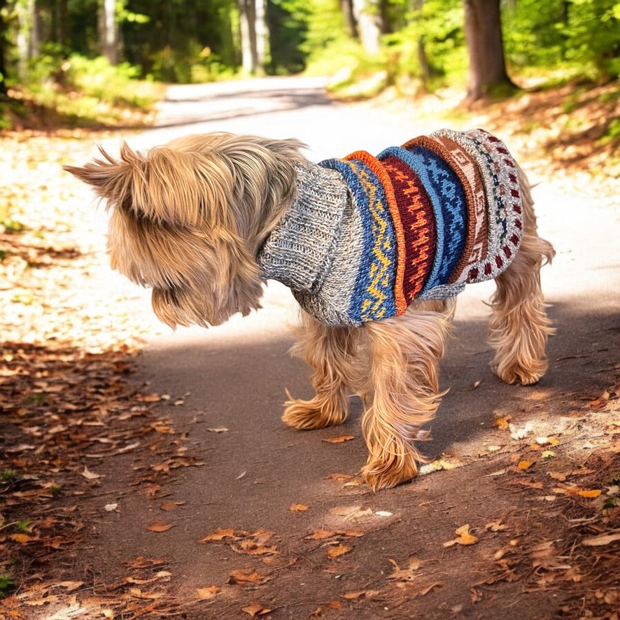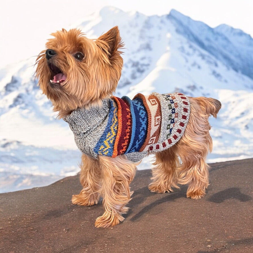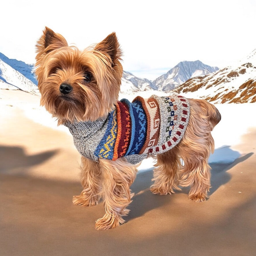 We call this doggie sweater the "Nazca", inspired by the Inca ruins in Nazca Peru. Very fascinating and definitely worth looking up but the patterns, designs, and colors are so fun!. We designed this sweater with a hole on the back so you can put your dog's harness on under the sweater and then clip the leash to the harness through the hole.