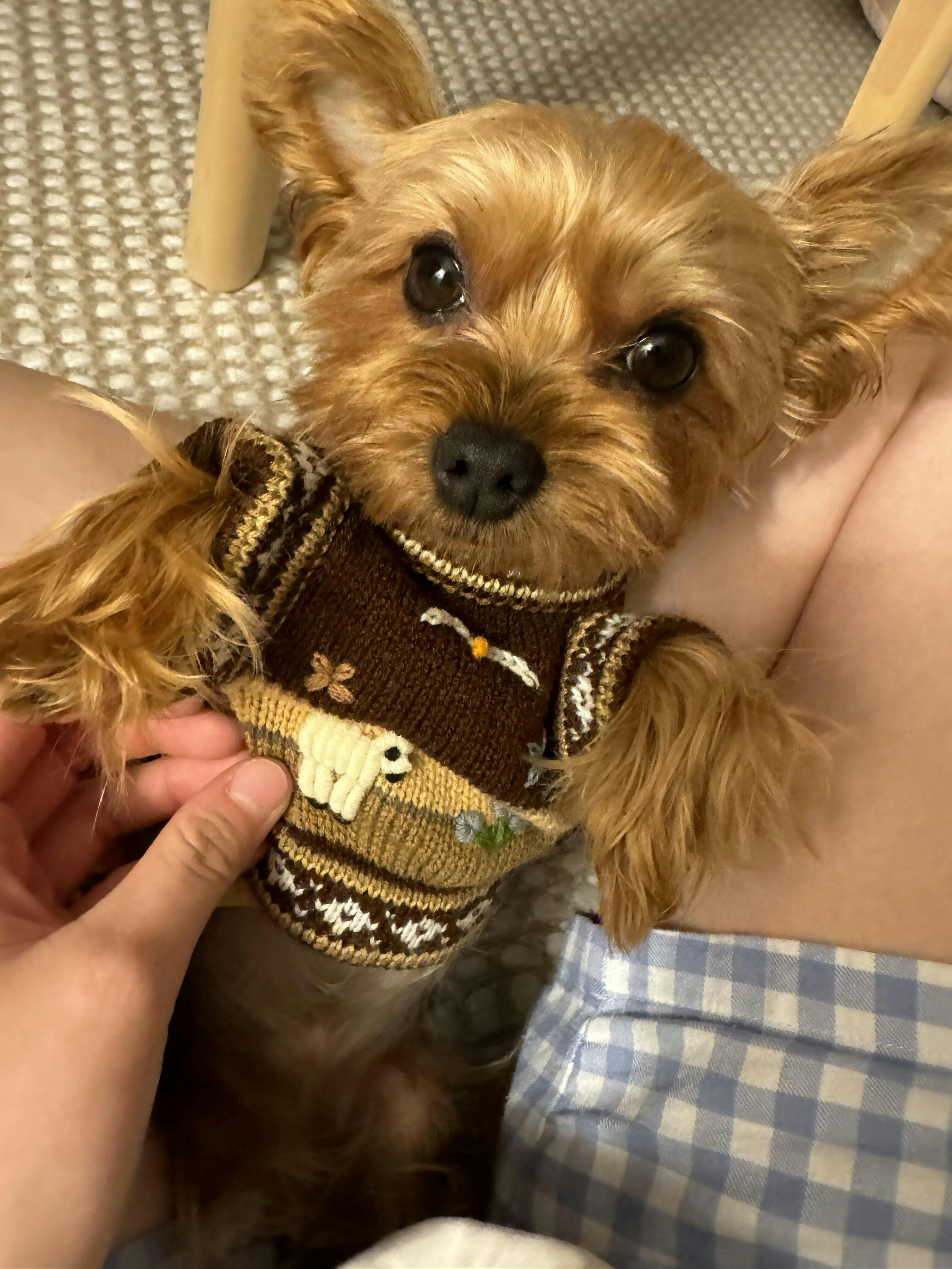 As far as doggy sweaters go, this is the finest you can get. The Peruvian alpaca is so soft your doggy will love how it feels. The beautiful colors will draw many compliments and the stretchy loose-knit makes it easy for you to put on your doggy.
