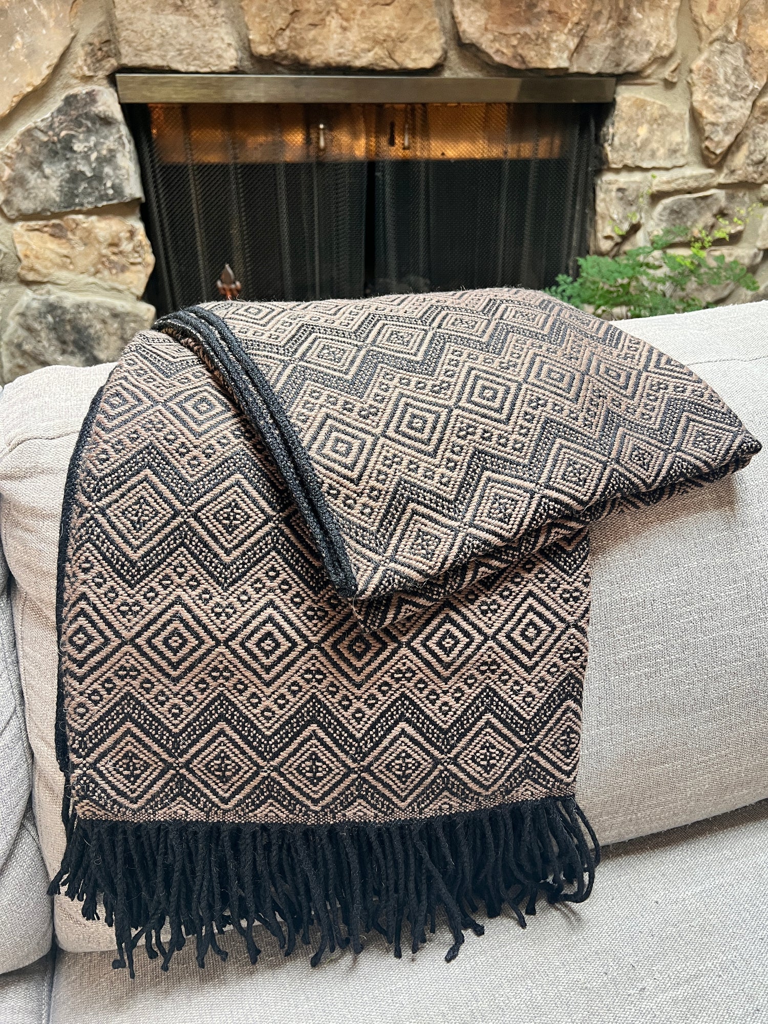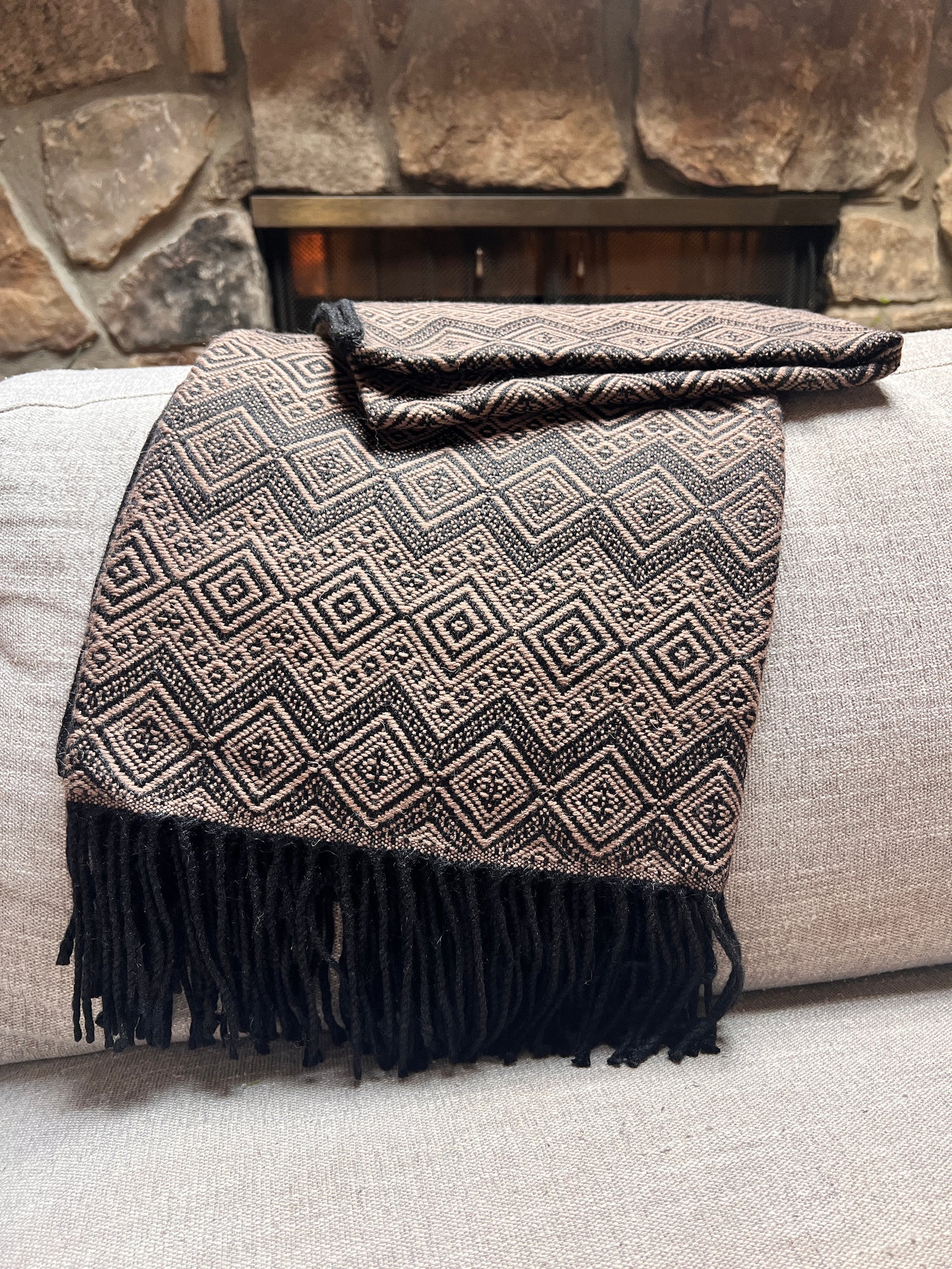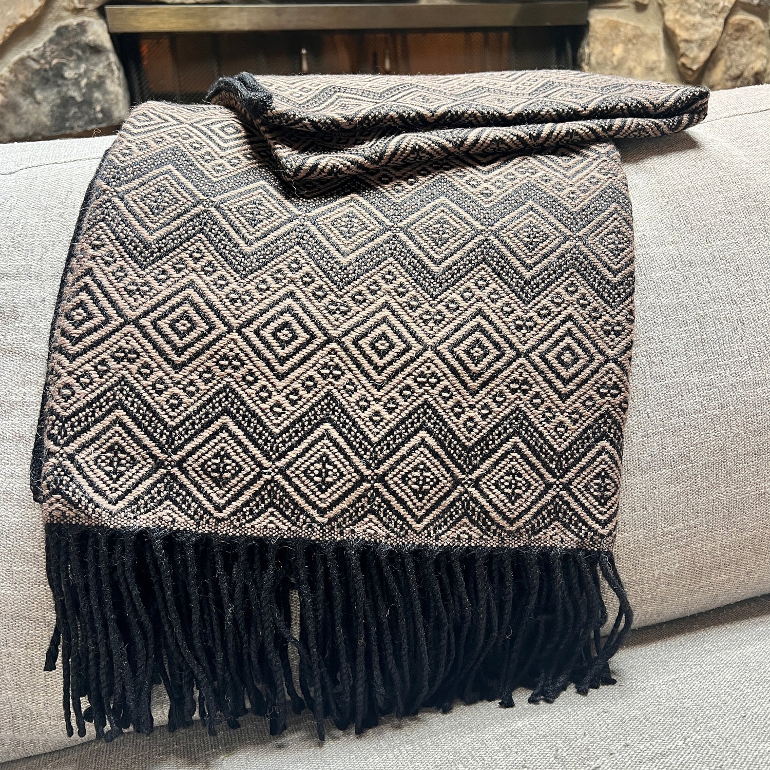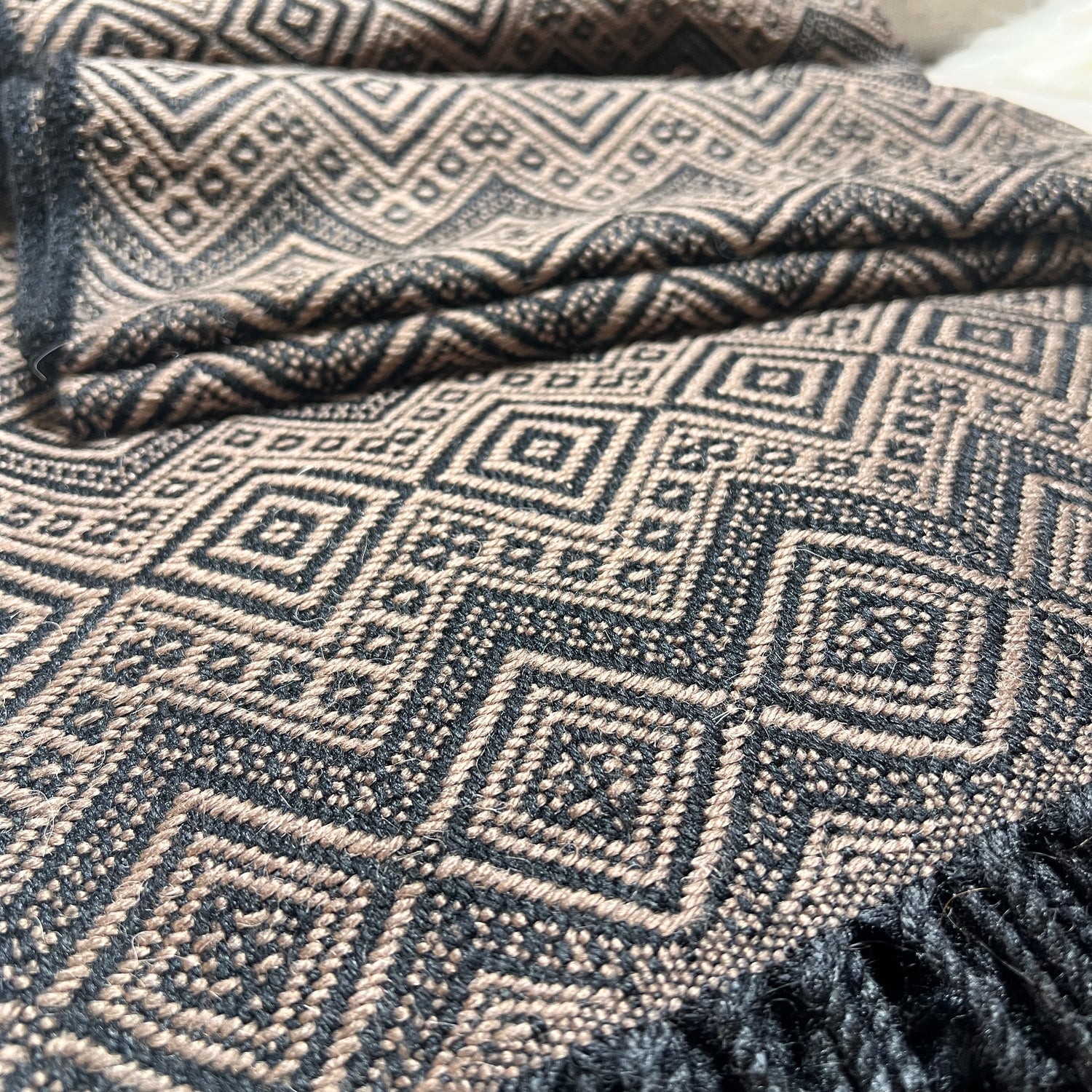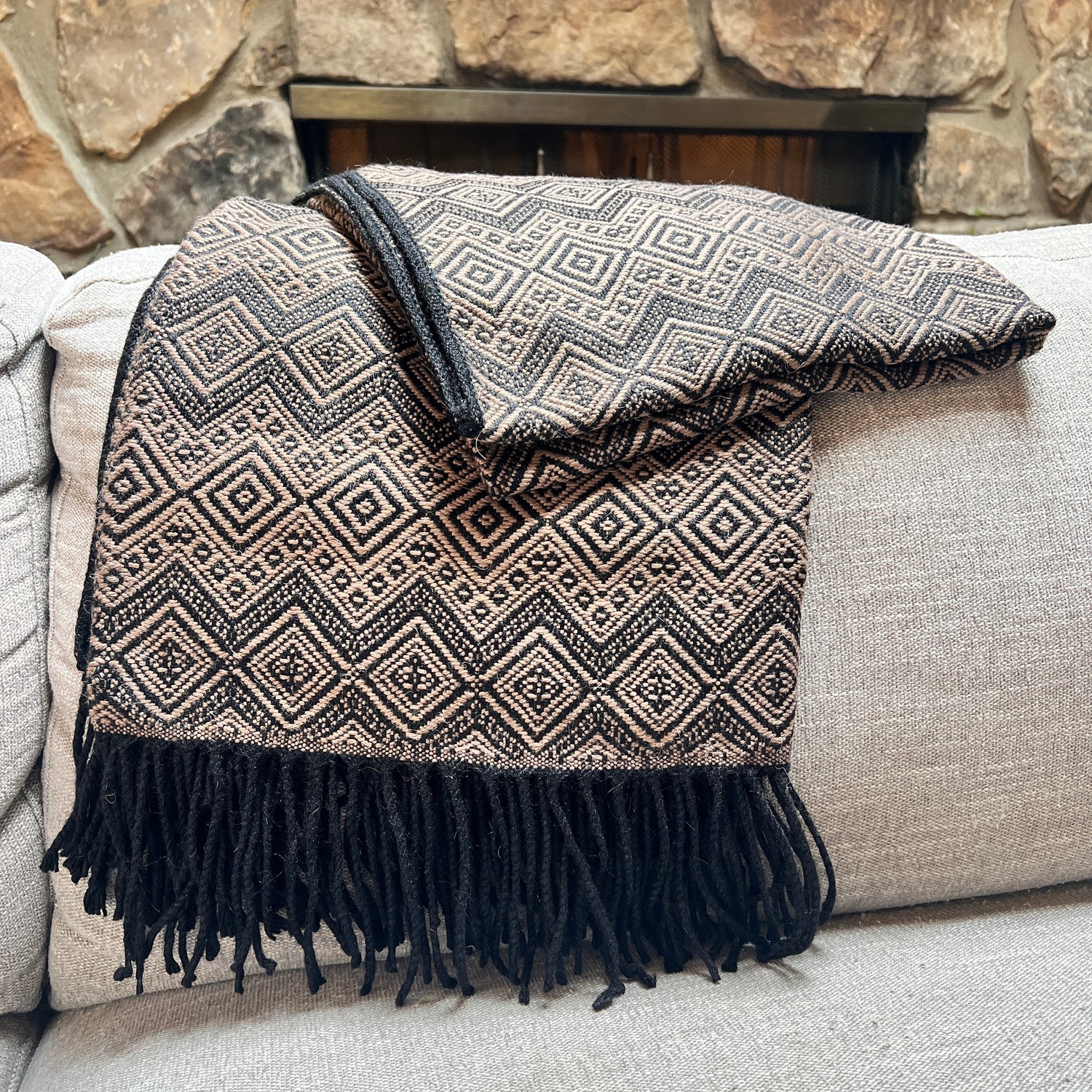 Our beautiful Andean Noir, black and beige Alpaca blankets are hand-loomed in the Andes of Peru and we use only the finest Alpaca wool and all-natural dyes. You will enjoy how soft the Dark Chocolate Alpaca blanket are, how the color does not fade, the warmth, the fact that they are hypo-allergenic, and regulate heat.
