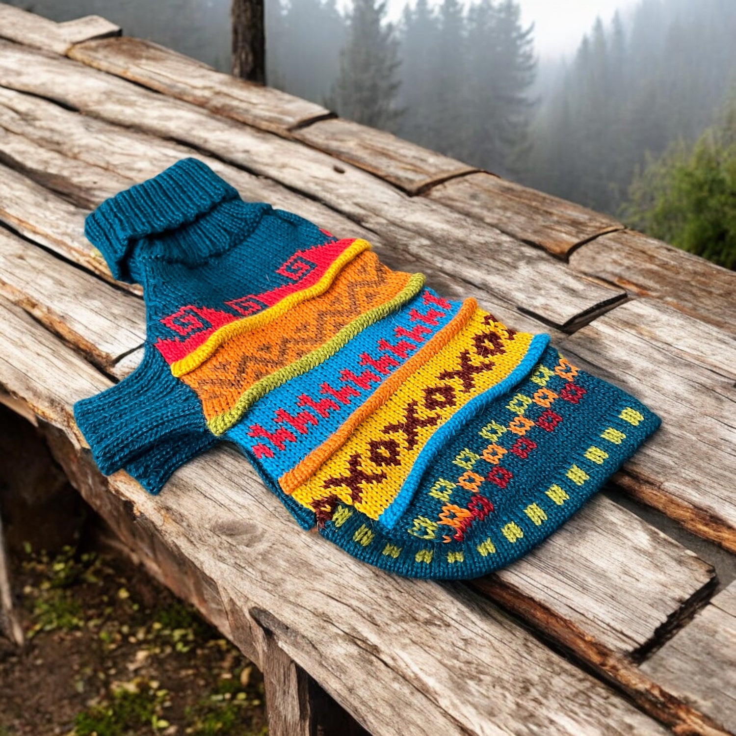 We call this doggie sweater the JADE Nazca QUARTER SLEEVE Nazca sweater, inspired by the Inca ruins in Nazca Peru. Very fascinating and definitely worth looking up but the patterns, designs, and colors are so fun!