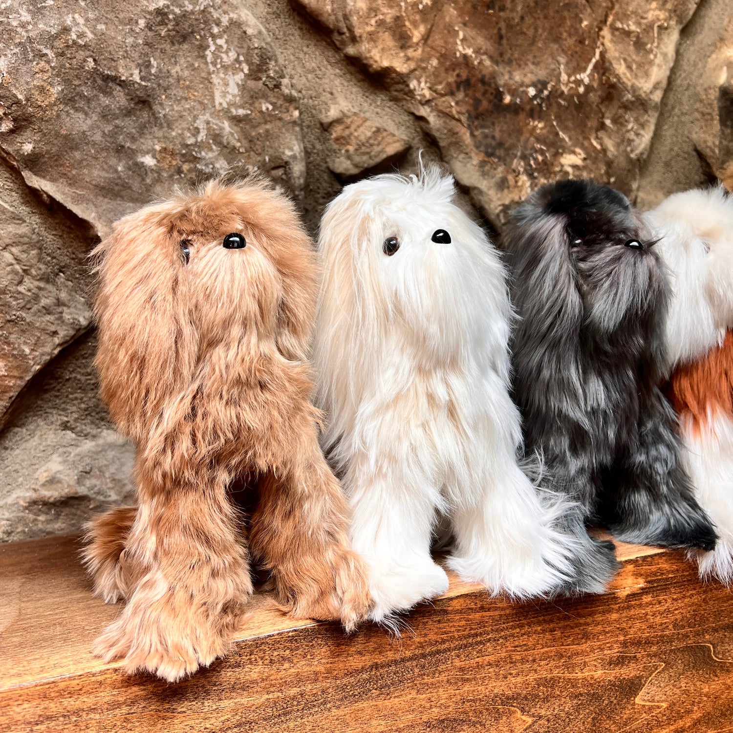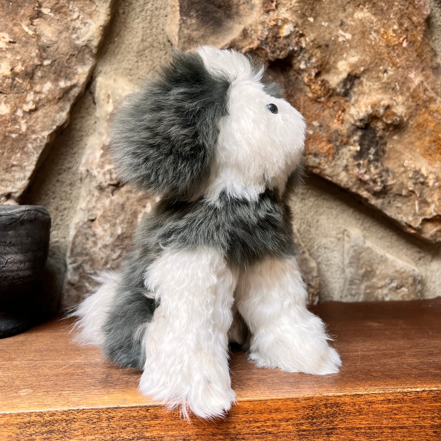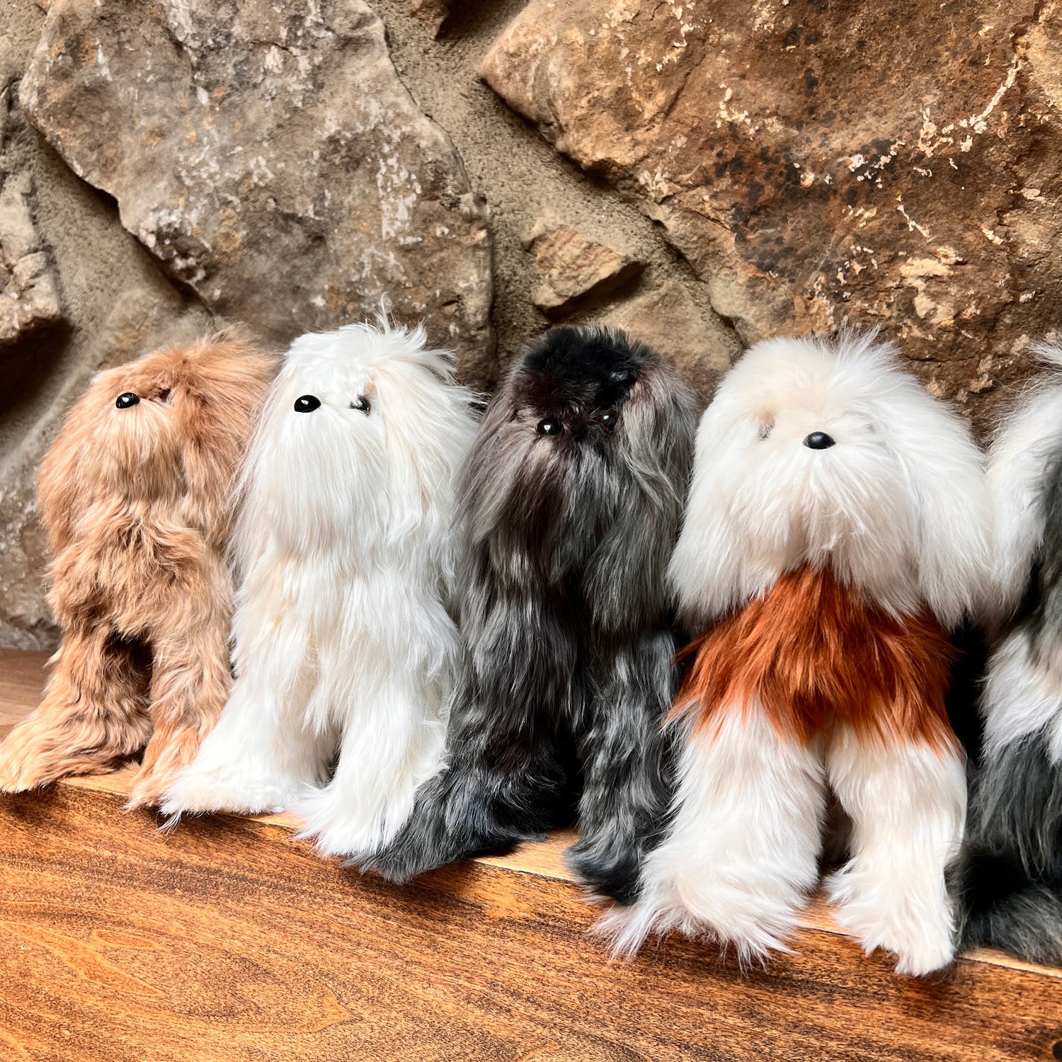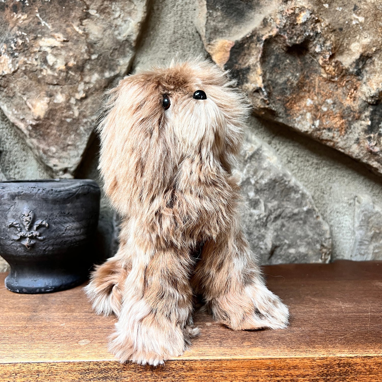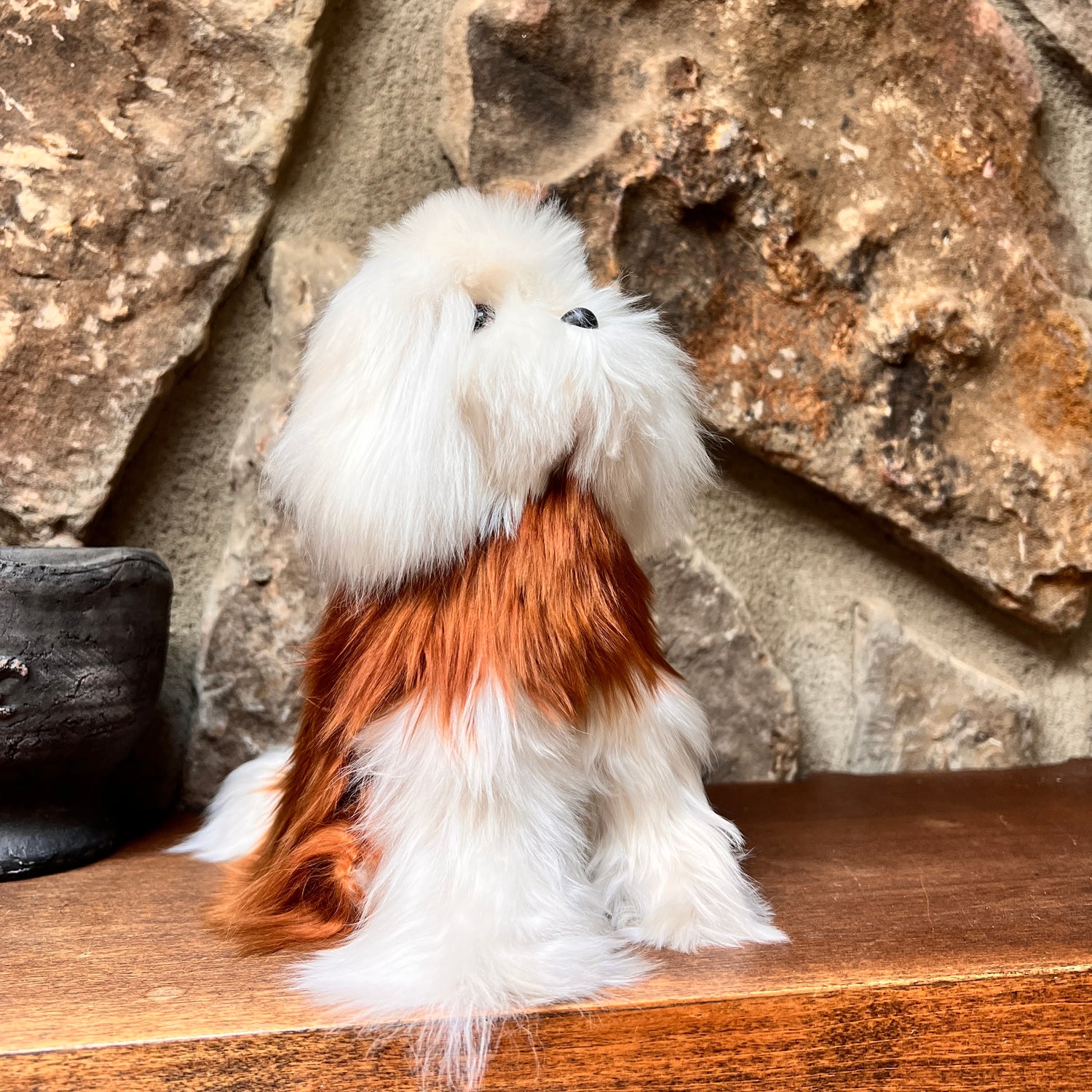 Handmade Luxury Baby Suri Alpaca Fur Dog – Medium Size. Measuring approximately 8 inches tall and 6 inches from toe to tail.